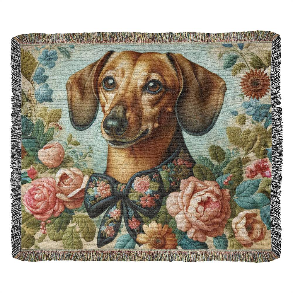 "Bow-Tied" Brown Smooth-Haired Dachshund Blue Floral Embroidery Inspired Woven Blanket