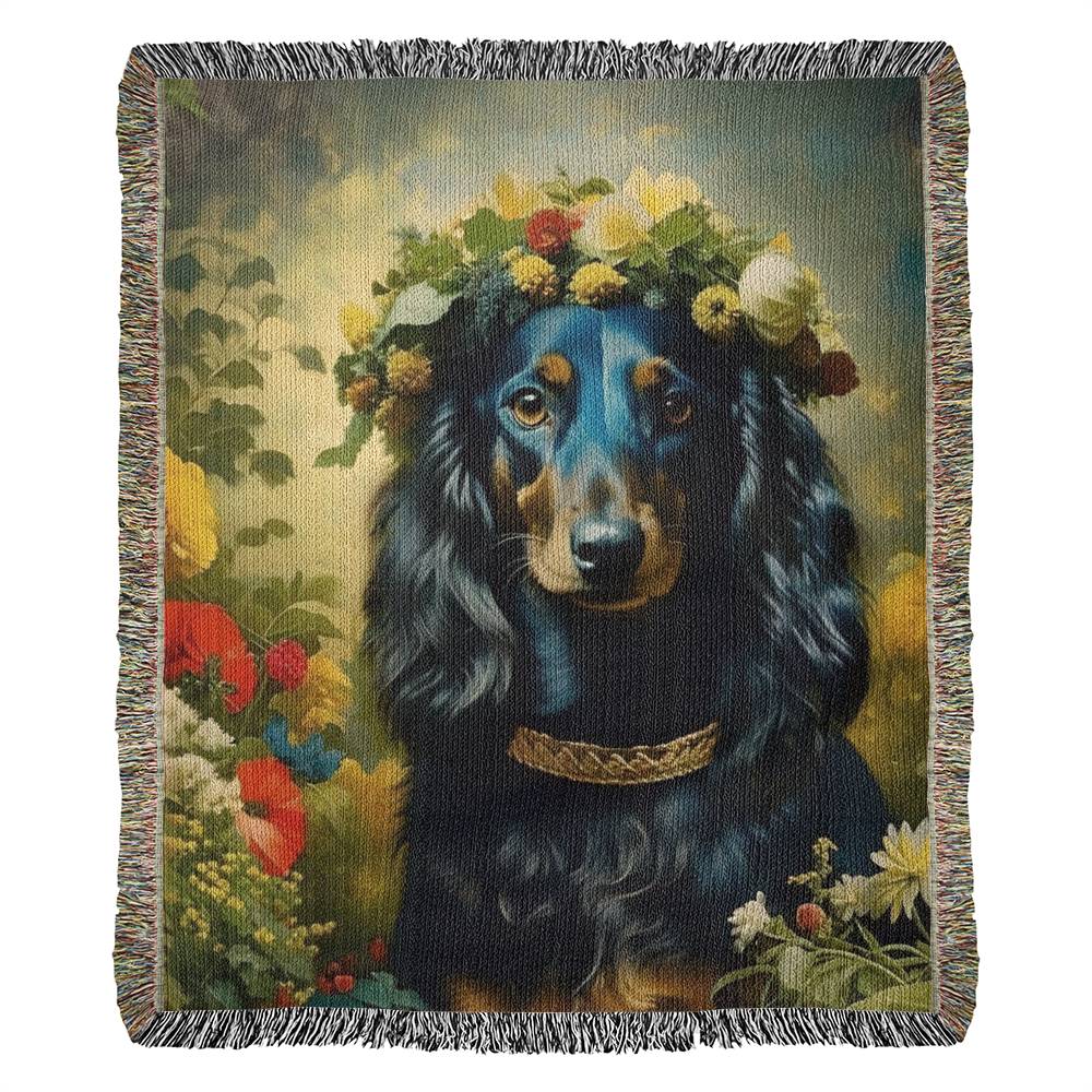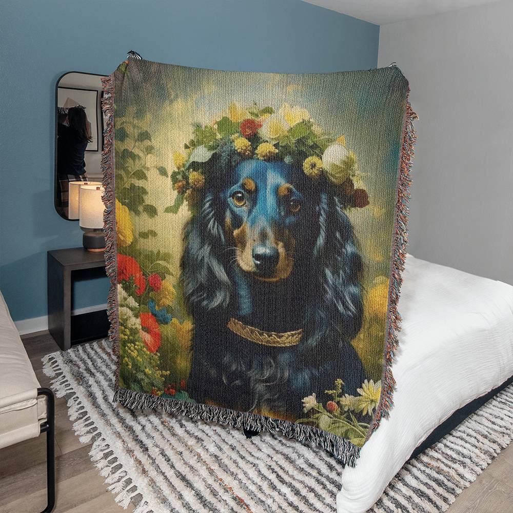 "Ebony Tresses" Black and Tan Long-Haired Dachshund Floral Impressionism Woven Blanket