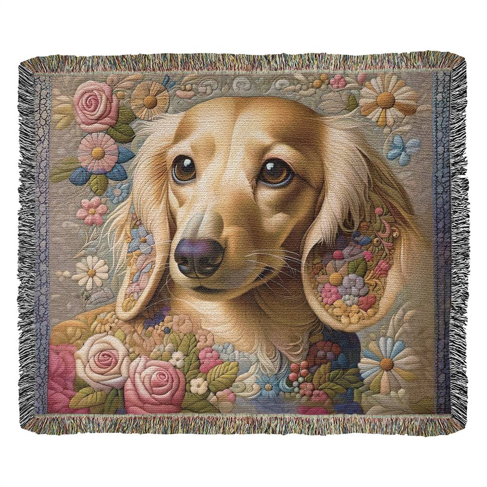 "Stitched Petals" Cream-Colored Long-Haired Dachshund Floral Embroidery Inspired Woven Blanket